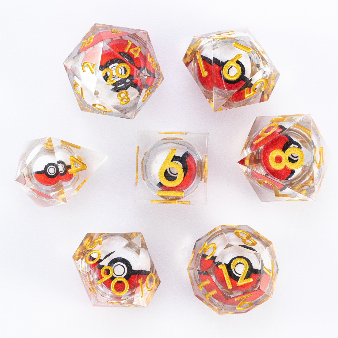 Get ready, Trainers! Elevate your tabletop experience with this uniquely themed Poké Ball RPG dice set. Each high-clarity resin die encases a classic red and white Poké Ball design, perfectly suspended and seemingly ready to capture your next critical victory.