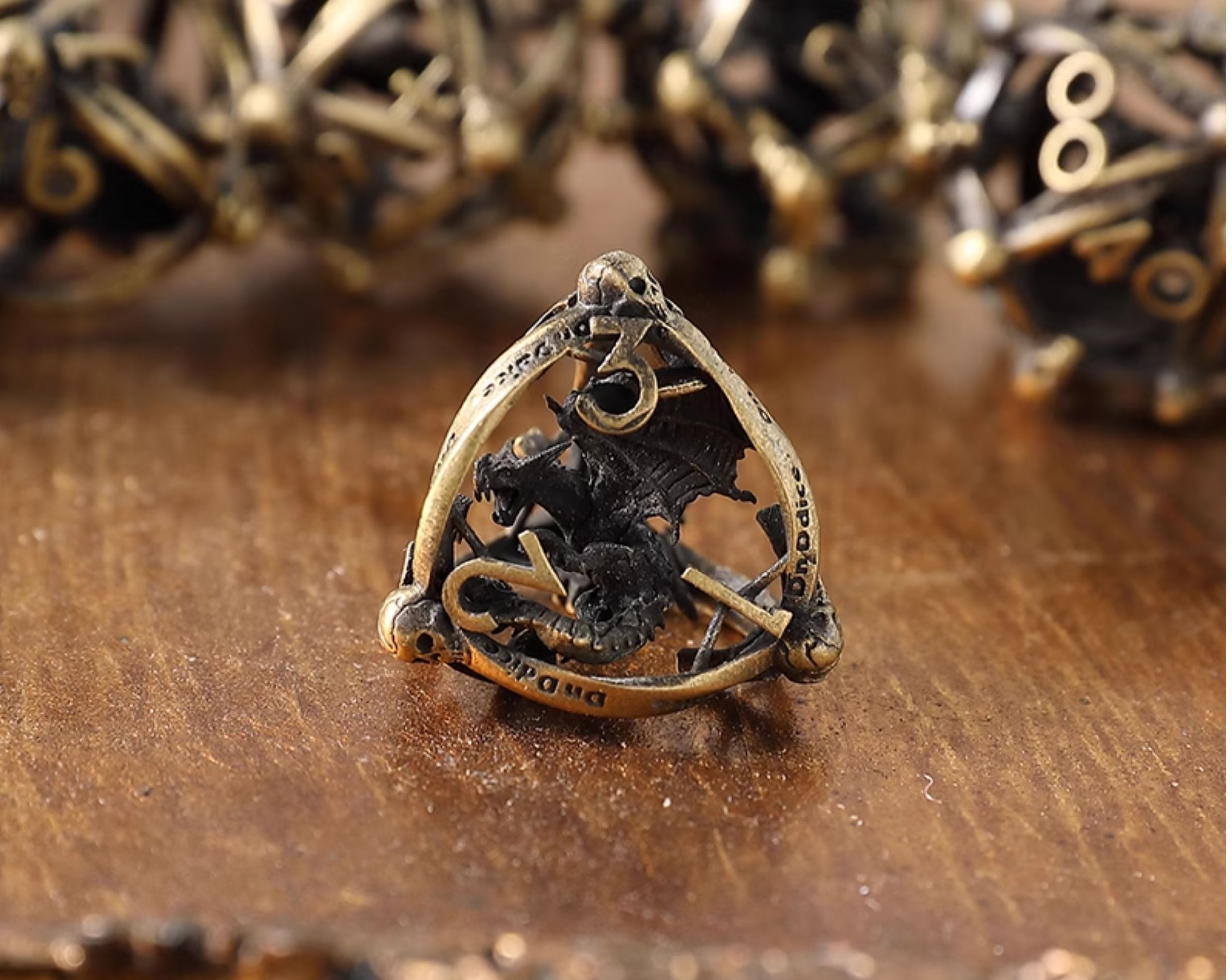 Cast from durable antique brass-colored alloy, every die boasts a satisfying hefty feel and a resonant metallic clink, ensuring each roll is imbued with ritualistic power. This set is the perfect gear for any epic fantasy RPG like Dungeons & Dragons or Pathfinder, especially suited for players running necromancers, dark knights, or rogue characters. Cast the Wyrmskull Cage, and face the challenge hidden in the heart of destiny!