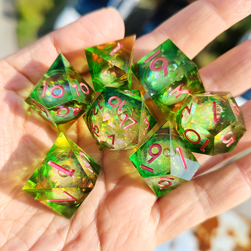 Shake to Awaken the Magic of the Old Woods! The "Emerald Elixir Dice" set is an utterly mesmerizing liquid core dice collection, with a central chamber holding swirling magic liquid and fine shimmering particles. The dice showcase a brilliant blend of vibrant emerald green and luminous golden-yellow, resembling a potion brewed by master elven alchemists or the water from the deepest, most mystical fey spring.