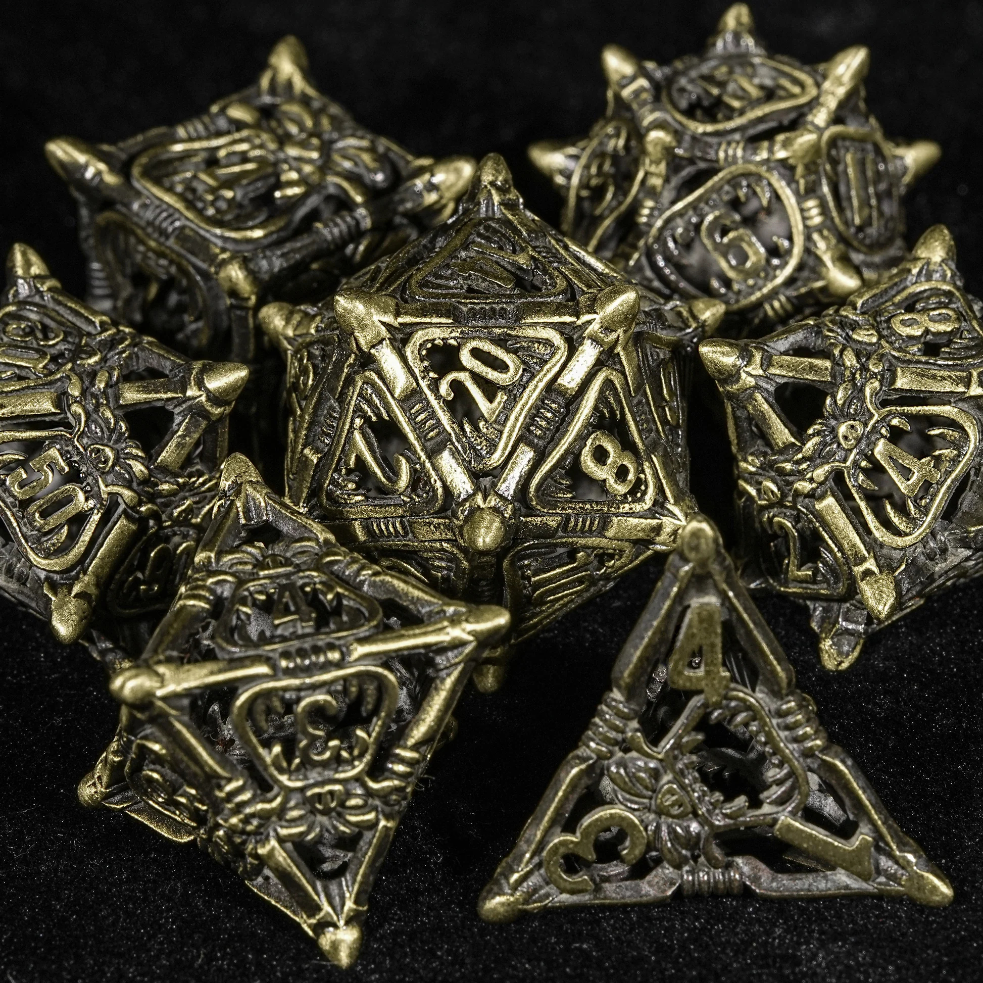 [DND 7Pcs Dice Set]: One set Metal Hollow dice total 7 pcs, including D4, D6, D8, D10, D12, D20 and D%. These 7-piece dice sets are hand-made by a jeweler who designs specialized gaming products. They are stunning. They are created with exceptional quality and are the perfect gift for any DND player, DM, or enthusiast of other board or table games.