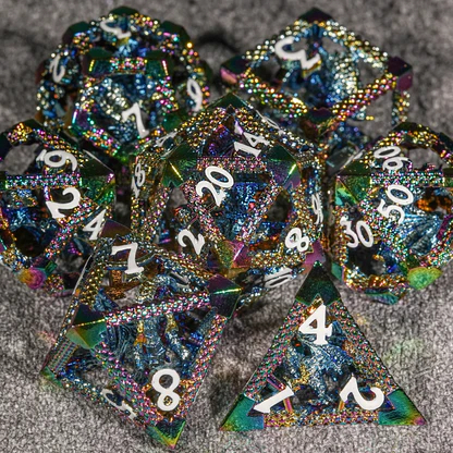 [DND 7Pcs Dice Set]: One set Metal Hollow dice total 7 pcs, including D4, D6, D8, D10, D12, D20 and D%. These 7-piece dice sets are hand-made by a jeweler who designs specialized gaming products. They are stunning. They are created with exceptional quality and are the perfect gift for any DND player, DM, or enthusiast of other board or table games.