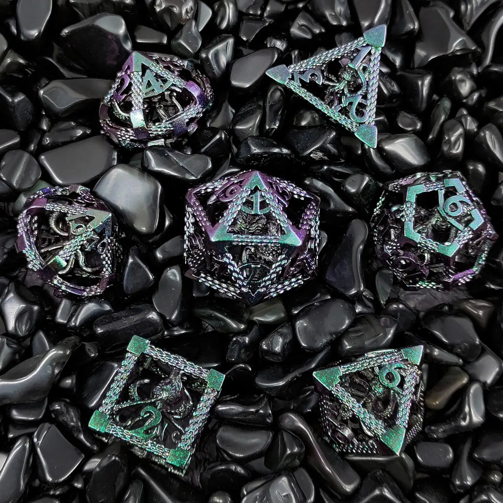 [DND 7Pcs Dice Set]:One set Metal Hollow dice total 7 pcs, including D4, D6, D8, D10, D12, D20 and D%. These 7-piece dice sets are hand-made by a jeweler who designs specialized gaming products. They are stunning. They are created with exceptional quality and are the perfect gift for any DND player, DM, or enthusiast of other board or table games.