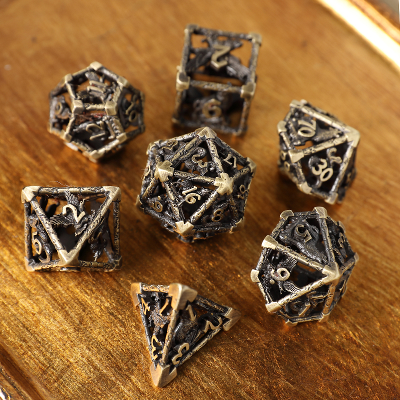 Harness the elemental power of the wild with The Primal Covenant metal dice set, your spiritual guide in every quest. This seven-piece polyhedral set is cast in a deep antique bronze hue, evoking the primal mysteries of ancient tribes and forgotten lore. The intricate hollow-carved structure elegantly incorporates the symbolic elements of the Eagle, Serpent, and Wolf totems: