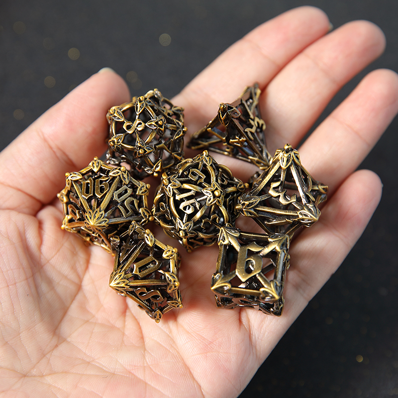 Infuse your tabletop campaigns with a touch of nobility and ancient power with The Royal Fleur-de-Lis dice set. This exquisite seven-piece metal set is finished in a rich antique reddish-copper hue, beautifully complemented by an intricate hollow-carved design featuring the Fleur-de-Lis (Iris) and intertwining vine patterns. Each face is etched with a symbolic elegance reminiscent of a sacred relic.