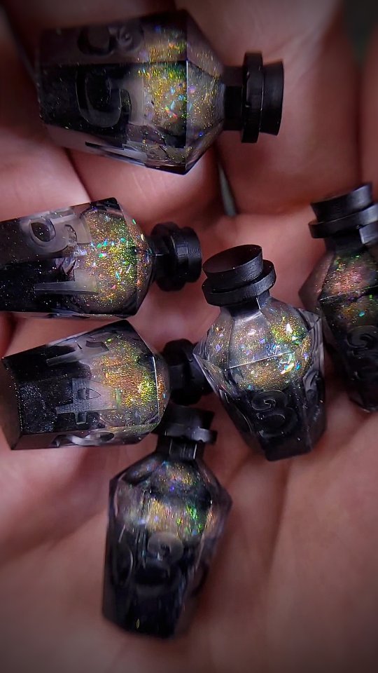 Each potion bottle is filled with deep black resin and shimmering golden-green sand. A gentle shake causes the sand to dance within, reminiscent of the fantastical scene of an ancient potion being activated. Clear numbers are engraved on the side of the bottle.